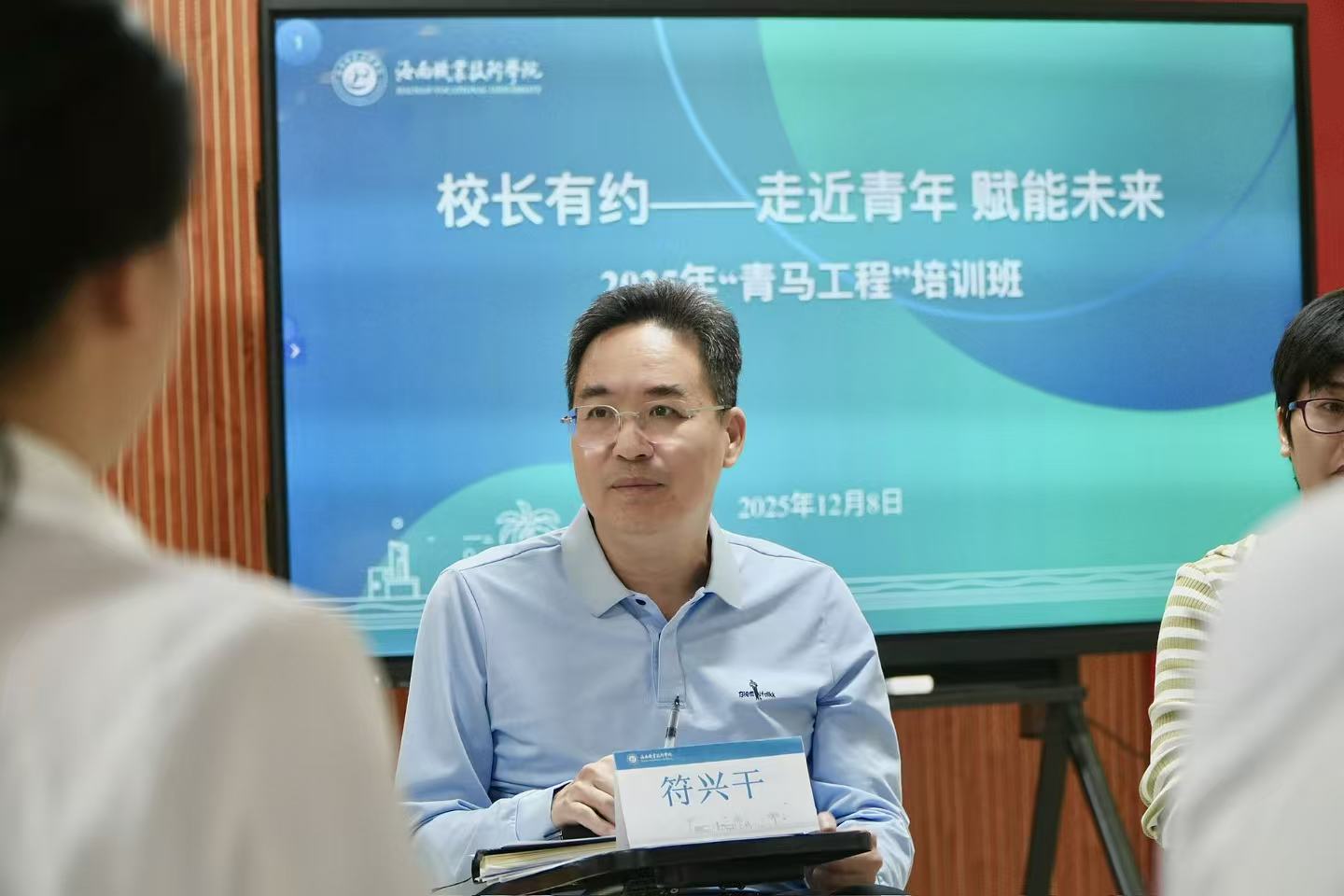 为扎实推进青年马克思主义者培养工程,搭建校领导与青年骨干面对面、心贴心的直通桥梁,切实关注并解决学员成长发展中的实际困惑,2025年12月8日,海南职业技术学院2025年“青马工程”培训班“校长有约——走近青年 赋能未来”活动在学校图书馆五楼党建活动室成功举办。学校党委委员、副校长符兴干,学生工作处处长吴多清,校团委书记方亿群出席活动,与“青马工程”培训班学员围坐一堂,围绕学员们关切的学习、生活与未来发展议题,展开了一场坦诚、务实、深入的对话交流。